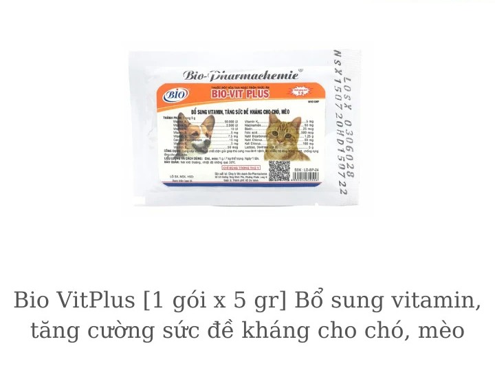 Bio VitPlus [5 gr] Bổ sung vitamin, tăng cường sức đề kháng cho chó, mèoCÔNG DỤNG:Cung cấp vitamin và chất điện giải giúp thú cưng mau lành bệnh, ăn nhiều, bộ lông mượt, chống rụng lông cho chó, mèo.CÁCH DÙNG:Chó, mèo: 1g/ 7kg thể trọng. Ngày 1 lần.