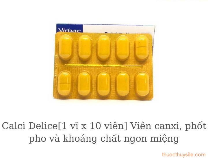 Calci Delice[1 vĩ x 10 viên] Viên canxi, phốt pho và khoáng chất ngon miệng cho chóTÍNH CHẤT Calci Delicecung cấp Canxi, Phospho, Flouride và Vitamin D3 theo tỷ lệ lý tưởng để cơ thể hấp thu tối đa. Canxi được bào chế dưới 3 dạng khác nhau để việc hấp thu được hiệu quả, giảm thất thoát. Vitamin D3 đóng vai trò quan trọng trong quá trình hấp thu và chuyển hóa của Canxi và Phospho. Mùi vị thơm ngon của thịt bò sẽ khiến thú cưng có thể ăn trực tiếp ngay trên chính tay của mình. CHỈ ĐỊNHPhòng và t.rị các b.ệnh do thiếu Canxi, Phospho, Flouride, Vitamin D3 và làm chắc khẻo xương trong các trường hợpChó con đang tăng trưởng: giúp phát triển cơ xương và thể vóc Chó đang mang thai và cho con bú: chó mẹ sẽ có nhiều sữa nuôi con, chó con sinh ra sẽ khỏe mạnh và mau lớn. Điều t.rị các b.ệnh về xương: gãy xương, loãng xương, phẫu thuật xương Chó có cường độ làm việc cao như chó đua, chó nghiệp vụNgăn ngừa huyết khối và hỗ trợ tim mạch.HƯỚNG DẪN SỬ DỤNG Chỉ định dùng trên chóCho ăn trực tiếp hoặc trộn với thức ănL.iều dùng: 1 viên/10kg thể trọng, cho ăn hằng ngày hoặc cách ngày, liên tục trong 30 ngày. Viên t.huốc có khía để phân chia l.iều dùng rõ ràng. BẢO QUẢN Bảo quản nơi khô mát, dưới 30 độ C và tránh ánh sáng trực tiếp