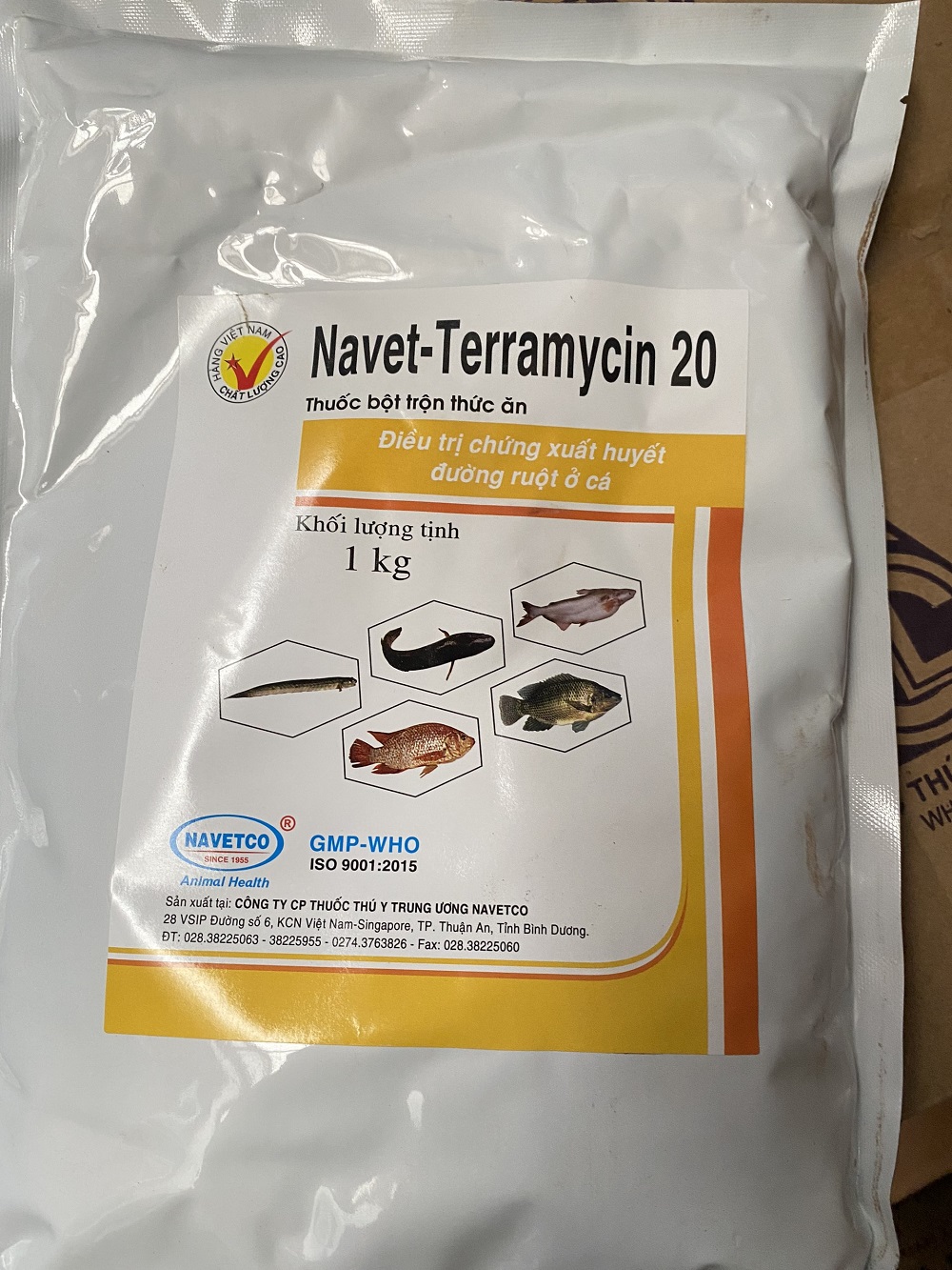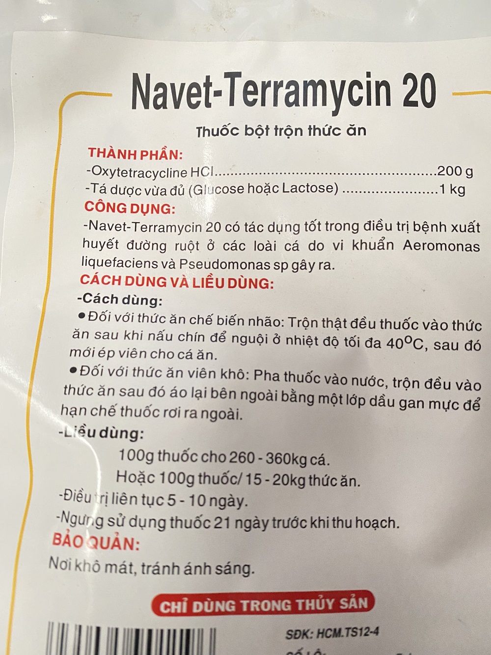 Thành Phần Hàm Lượng Oxytetracycline HCl 200 g Tá dược vừa đủ (Glucose hoặc Lactose) 1 kg Công Dụng Navet-Terramycin 20 có tác dụng tốt trong điều trii xuất huyết đường ruột ở các loài cá do vi khuẩn Aeromonas liquefaciens và Pseudomonas sp gây ra. Cách Dùng và Liều Lượng Cách dùng: Đối với thức ăn chế biến nhão: Trộn thật đều vào thức ăn sau khi nấu chín để nguội ở nhiệt độ tối đa 40oC, sau đó mới ép viên cho cá ăn. Đối với thức ăn viên khô: Pha thuốc vào nước, trộn đều vào thức ăn sau đó áo lại bên ngoài bằng một lớp dầu gan mực để hạn chế rơi ra ngoài. Liều dùng: 100g cho 260 - 360kg cá. Hoặc 100g / 15 - 20kg thức ăn. Điều trii liên tục 5 - 10 ngày. Ngưng sử dụng 21 ngày trước khi thu hoạch. Bảo Quản Nơi khô mát, tránh ánh sáng.