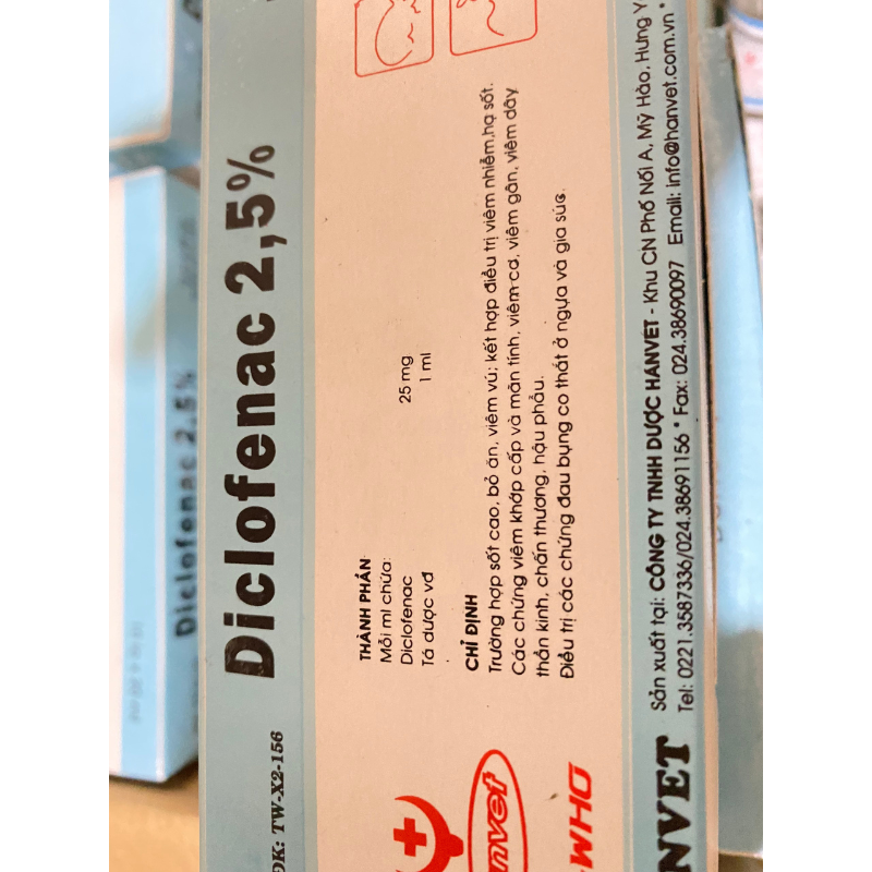 Diclofenac 2.5% [20 ml] vật nuôi sốt cao, bỏ ăn, viêm nhiễm hạ sốt trên chó mèo heo trâu bò dê cừu các chứng viêm khớp cấp và mãn tính trên thú, viêm cơ, viêm dây thần kinh Hướng dẫn sử dụng chi tiết in trên sản phẩm Shop luôn cam kết, đảm bảo hàng chất lượng, chính hãng Giá cực kỳ cạnh tranh cho quý khách hàng Cam kết đổi trả, nếu sản phẩm không đúng với miêu tả. Quý khách hàng yên tâm mua sắm tại shop Chúc quý khách hàng có những trải nghiệm mua sắm thật thú vị trên sàn