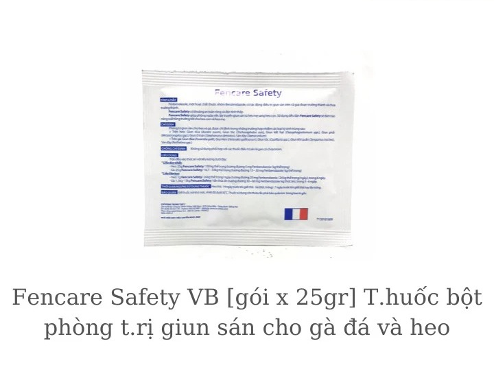 Fencare safety [25 gr] bột phòng chống giun sán cho heo và gàCÔNG DỤNG:Phòng ngừa và t.rị giun sán trên gà, heo.CÁCH DÙNG:Liên tục:Gà: 1.5- 3 gram / 10kg thức ăn trong 3-6 ngàyHeo: 1 gram/ 24 kg thể trọng/ ngày trong 6 ngàyL.iều duy n.hất:Gà: 25 gram/ 16.7- 33 kg thể trọngHeo: 25 gram/ 100kg thể trọng.