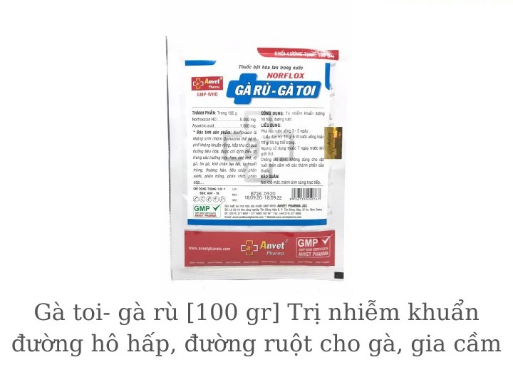 Gà toi- gà rù [100 gr] T.rị nhiễm khuẩn đường hô hấp, đường ruột cho gà, gia cầmCÔNG DỤNGT.rị nhiễm khuẩn đường hô hấp, đường ruột, hen, khò khè, rù gà, toi gà, khô chân bại liệt, tụ huyết trùng, thương hàn, tiêu chảy, phân xanh phân trắng, phân nhớt, phân sáp,...CÁCH DÙNGPha vào nước uống 3-5 ngày.L.iều đặc t.rị: 10g/ lít nước uống hoặc 10g/ 50kg thể trọng.