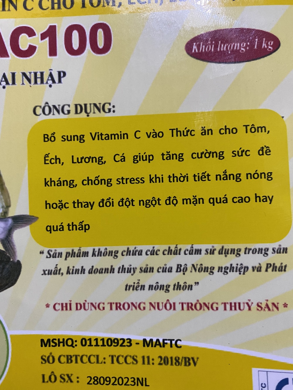 Vitamin C cho cá, tôm, ếch, lươn biovet gói 1 kg Bổ sung vitamin C cho cá, tôm, ếch, lươn, giúp tăng cường sức đề kháng Trộn đều 4-5g/ kg thức ăn, sử dụng liên tục suốt vụ nuôi.